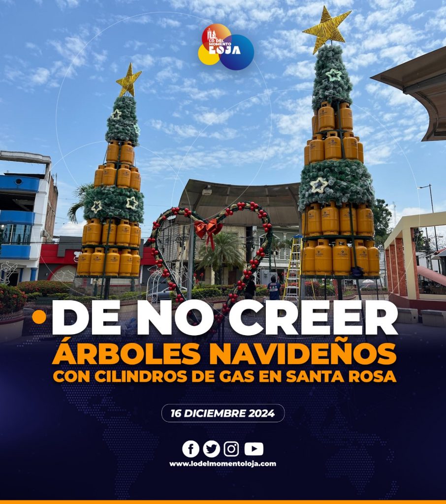 😱🎄⚠️¡Polémica en El Oro! El cantón de Santa Rosa, llamó la atención debido a que en un plaza se instalaron dos árboles de Navidad hechos con tanques de gas, dicha iniciativa ha generado polémica en redes sociales, donde se ha cuestionado el uso de los cilindros. Sin embargo, el alcalde Larry Cevallos aclaró que los tanques estaban vacíos, por lo que no representan ningún peligro para la comunidad y posteriormente, cuando termine la época navideña, los cilindros serán retirados y nuevamente llenados para entregarlos a familias de bajos recursos.