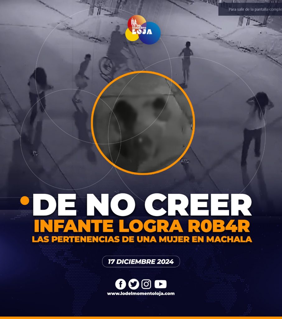 ¡No le importó nada! Una cámara de seguridad, captó el momento exacto cuando un menor de edad golpea a una señorita tirándola al piso para quitarle sus pertenencias y luego salir corriendo para escapar con lo r0b4d0. El hecho ocurrió en Machala – El Oro.