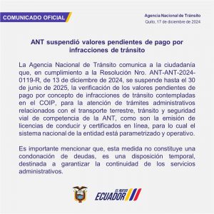 ¡Hasta junio del 2025! La Agencia Nacional de Tránsito a suspendido temporalmente la verificación de los valores pendientes de pago por infracciones de tránsito, una medida que estará vigente hasta el 30 de junio de 2025. Dicha resolución, oficializada el 13 de diciembre de 2024, tiene como objetivo garantizar la continuidad de servicios administrativos esenciales, como la emisión de licencias de conducir y certificados en línea. Esta decisión se toma para evitar interrupciones en el sistema nacional de la ANT, que podría verse afectado por la necesidad de ajustes operativos.