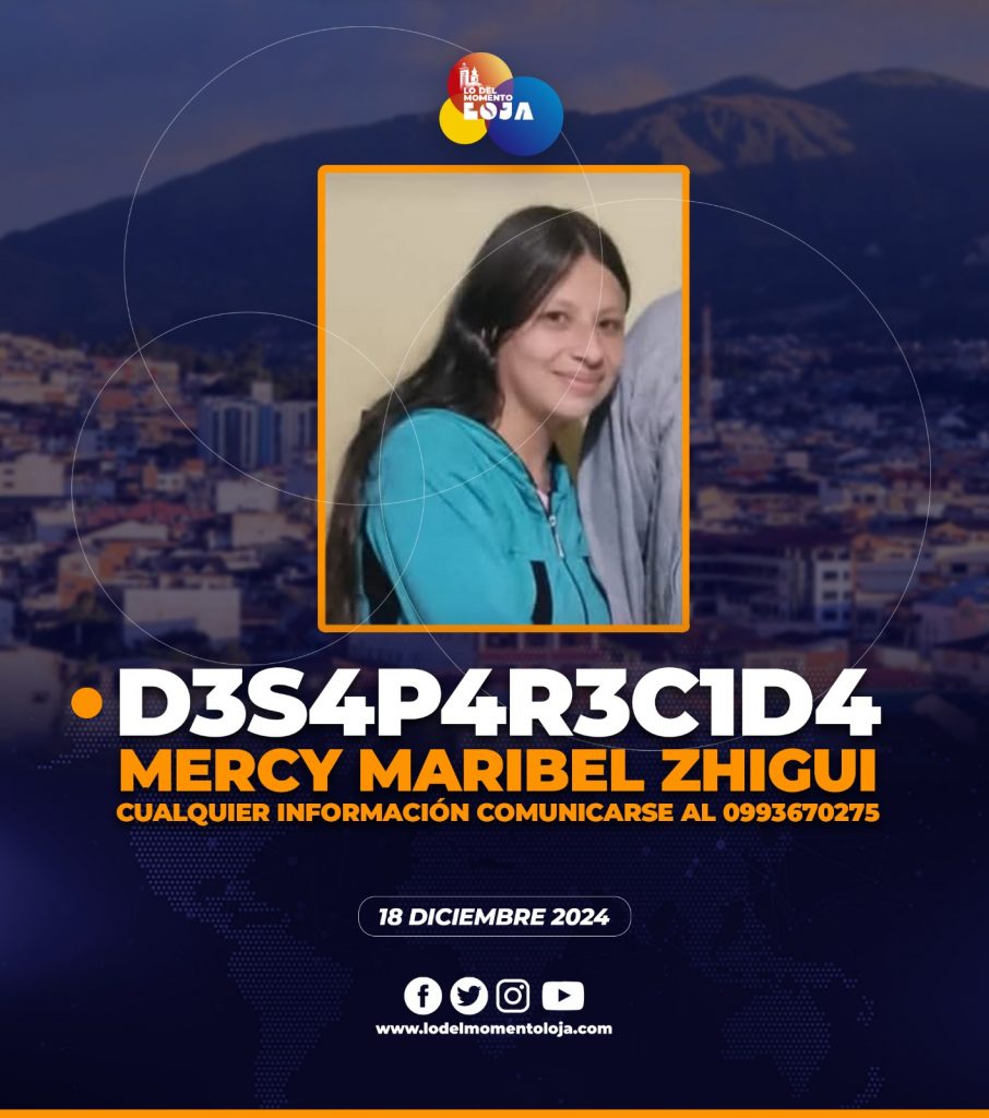¡Máxima difusión! Mercy Maribel Zhigui González, de 29 años de edad, quien tiene una discapacidad física del 44%, fue reportada como d3s4p4r31d4 en la ciudad de Loja, desde horas de la tarde del 17 de diciembre de 2024, en el Barrio Punzara (Calle Issac Albeniz y Guiseppe Verdi), la misma vestía pantalón jean y chompa color beige.