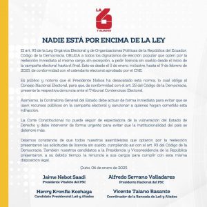 📝⚠️🔎 ¡Llaman a medio mundo! El Partido Social Cristiano ha emitido un comunicado señalando que CNE debe presentar denuncia ante el TCE por que el presidente Noboa no habría pedido licencia para participar en campaña de las elecciones generales 2025. Pero no es lo único, también hizo el llamado a la Contraloría (CGE) para que evite el uso de los recursos públicos en la campaña electoral y sancionar a quienes hayan cometido esta infracción. Finalizaron, haciendo el llamado a la Corte Constitucional debe intervenir y evitar que la institucionalidad del país se baja a pique.