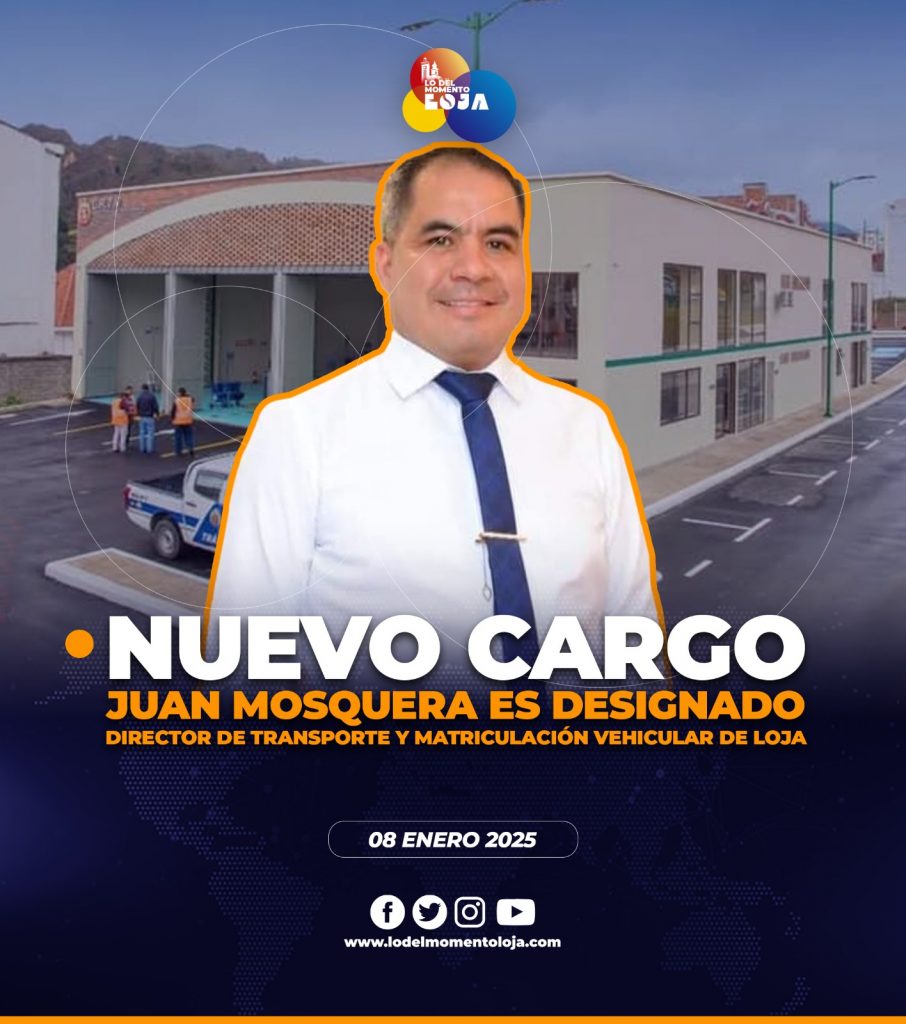 ¡Con amplia experiencia! El 07 de enero del 2025, el Mgtr. Juan Bolívar Mosquera Granda, ha sido designado como nuevo Director de Transporte y Matriculación Vehicular del Municipio de Loja, quien con más de 10 años de experiencia en el sector público, ha trabajado como especialista de Matriculación Vehicular desde febrero del 2024.