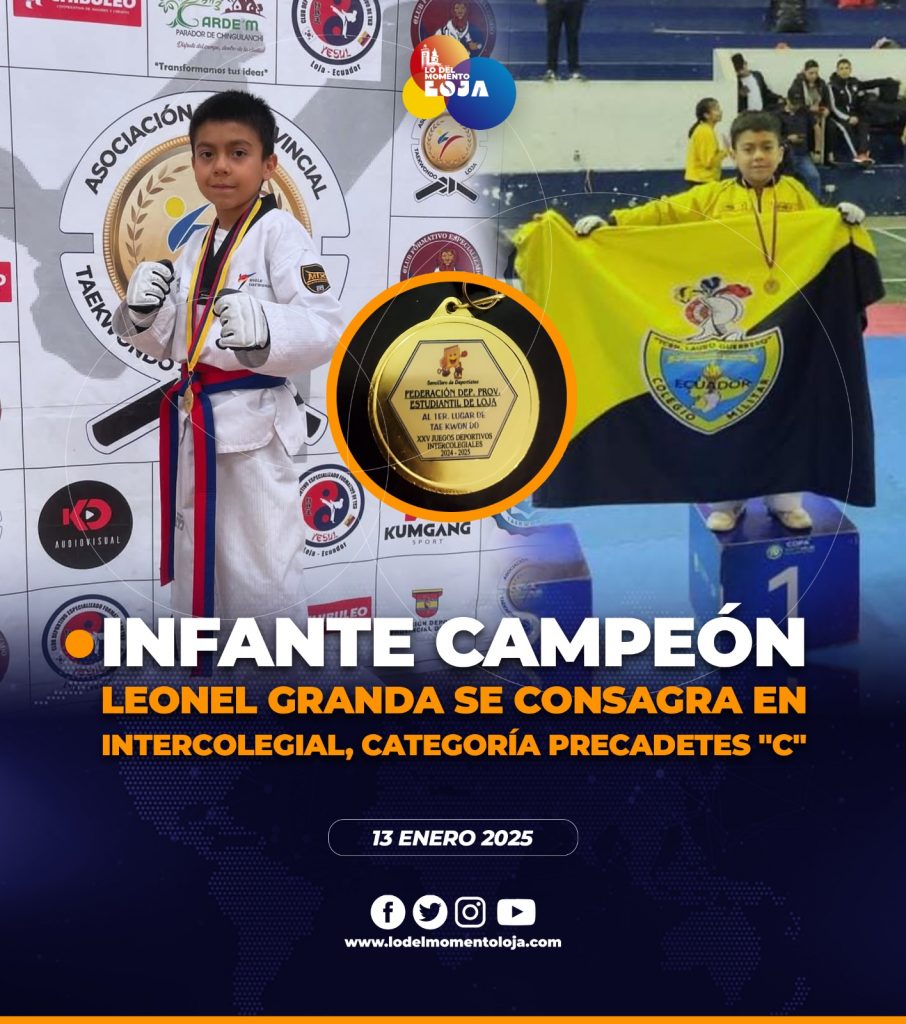 🏅👦🏻🥋 !Logro obtenido¡ El infante, Leonel Andrey Granda Guerrero, estudiante del Colegio Militar N° 5 Lauro Guerrero, se coronó campeón en TAE KWON DO de la categoría en Precadetes “C” FLY tras vencer en una reñida final al representante de la Unidad Educativa Particular Antonio Peña Celi (APC) por XXV edición de los Juegos Deportivos Intercolegiales. La competencia, que reunió a destacados deportistas, puso de manifiesto la técnica y el talento del joven lojano, quien demostró su preparación y disciplina en cada combate.