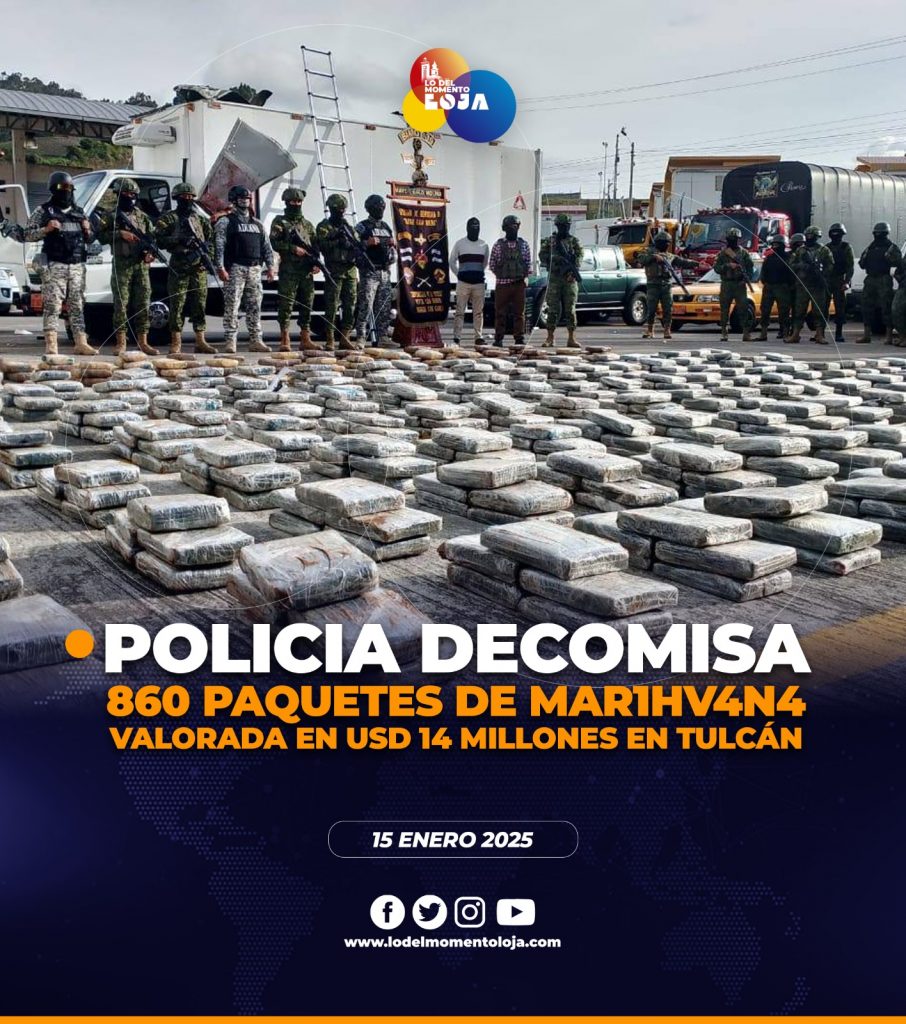 😱🚨👮🏻♂️¡Operativo frontera! Policía Nacional en coordinación con FF.AA. logró decomisar un total de 860 paquetes con m4r1hv@na ocultas en un camión que circulaba por la ‘Y’ del Barrial, en el cantón Tulcán. Mediante esta acción se impidió la distribución y venta de 1’720.00 dosis, que estarían valoradas en el mercado nacional en cerca de los USD 14,6 millones, según informó la Policía.