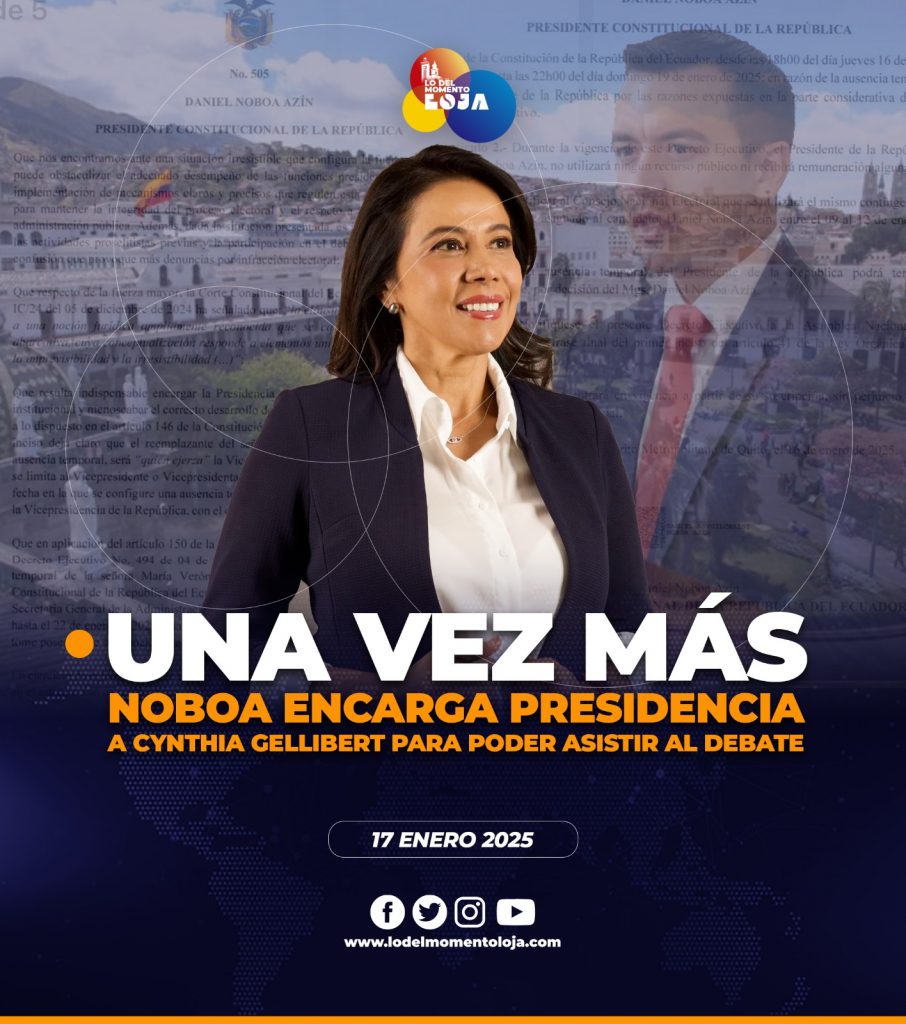 😱🗣️📄¡Mediante decreto! El primer mandatario de Ecuador, Daniel Noboa, a través del Decreto Ejecutivo 505, encargó la Presidencia de la República a Cynthia Gellibert Mora, secretaria de la Administración y a quien designó previamente como vicepresidenta encargada, para retomar la campaña electoral. La medida rige desde “las 18:00 del día jueves 16 de enero de 2025 hasta las 22:00 del día domingo 19 de enero de 2025”, ws decir, hasta la fecha prevista para el debate obligatorio de los candidatos a la Presidencia.