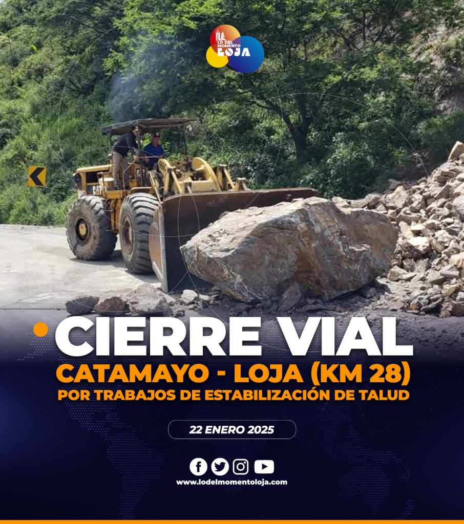 🛑🚧🛣️ ¡Cierre temporal! Debido a los trabajos de estabilización de talud (perforación y voladura de rocas de gran magnitud), se cierra de manera temporal la vía Catamayo – Loja, en el kilómetro 28 sector Carbonero, hasta las 13h30. Autoridades anuncian que se ha habilitado un desvío para vehículos livianos, por lo que se pide a los conductores que transitarán por el lugar, conducir con precaución.