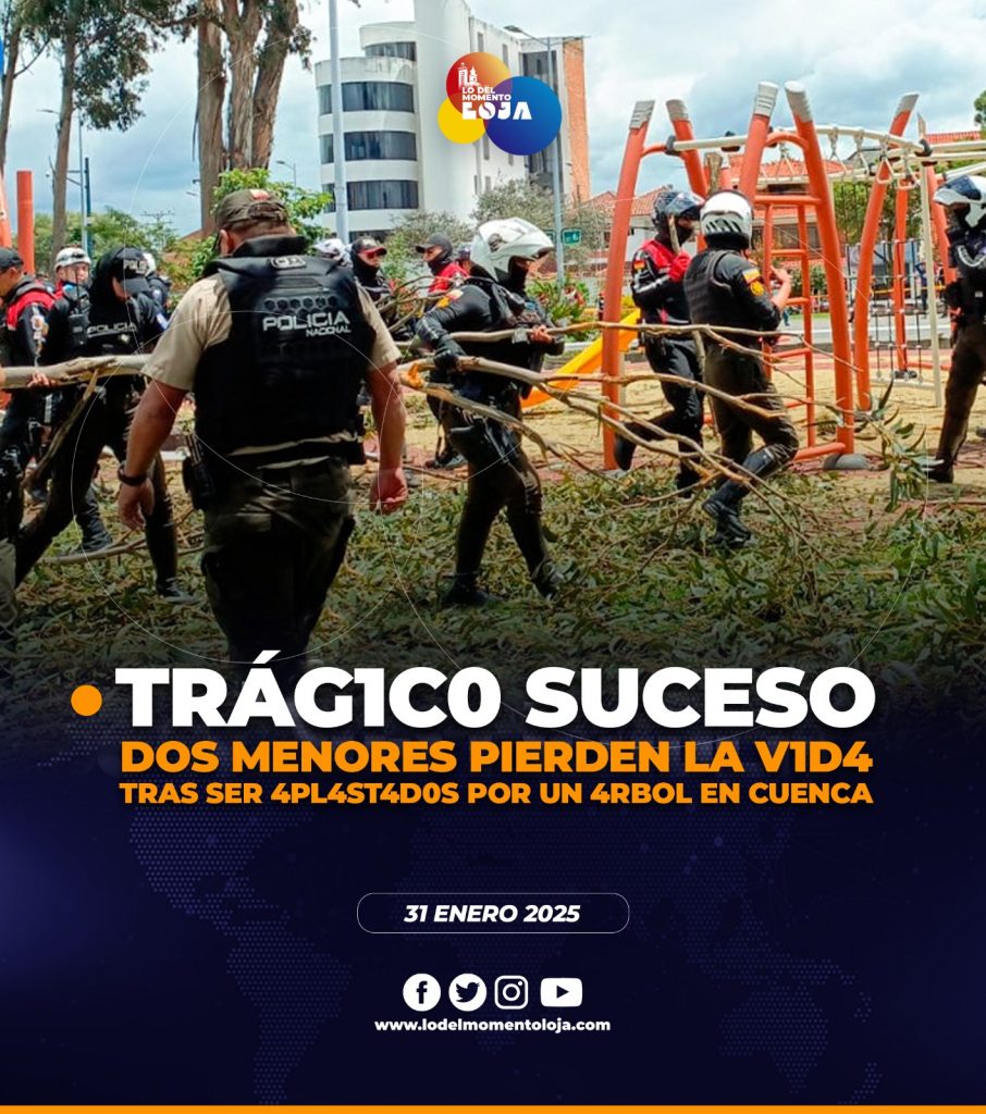 😱🌲🚸¡Terrible suceso! Dos menores de edad f4ll3c13r0n como consecuencia de la repentina caída de un conjunto de tres árboles de eucalipto en el Parque La Paz, ubicado en la avenida Remigio Crespo y calle Imbabura, en la ciudad de Cuenca. El hecho ocurrió durante horas de la tarde del 30 de enero, produciendo un fuerte estruendo que alarmó a los moradores de la zona. Al verificar lo sucedido, los habitantes constataron la tragedia e intentaron ayudar a los afectados, quienes lamentablemente no lograron sobrevivir.