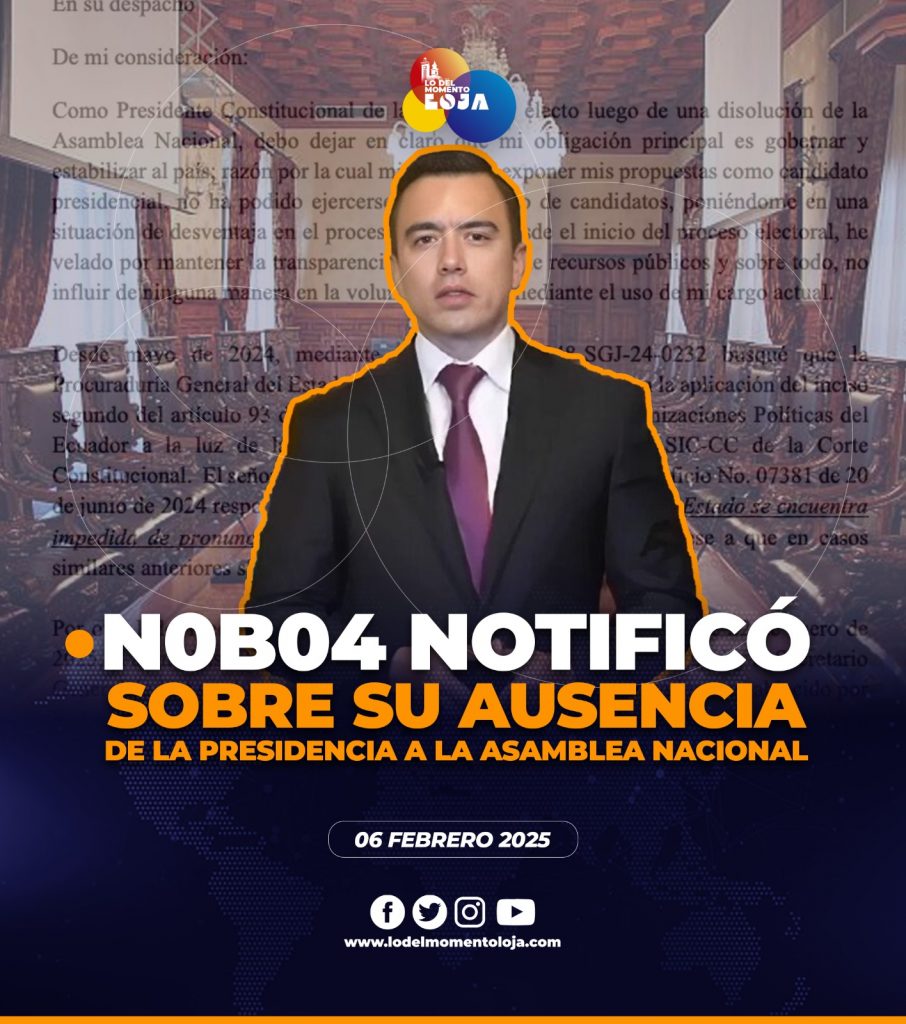😱📆👋🏻¡’Solo por hoy’! El presidente D4n13l N0b04 notificó a la Asamblea y a la vicepresidenta encargada Cynth14 G3llib3rt, sobre su ausencia temporal de la Presidencia desde las 05h00 hasta las 23:59 de este 6 de febrero. Además la emisión de dicho documento tiene como finalidad describir los hechos que configuran la fuerza mayor de su ausencia, más no declararla.