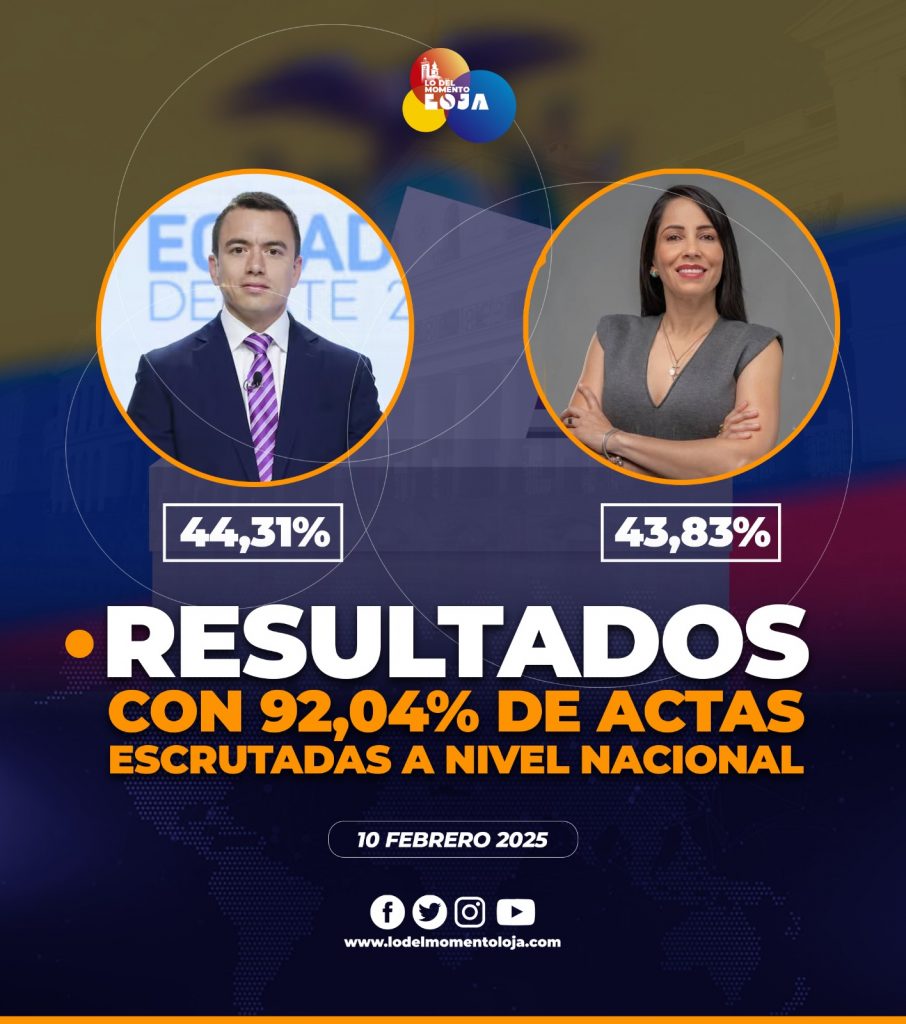 😱🗳️📊 ¡Elecciones 2025! Con corte de 09h20 de este 10 de febrero, el 92,04% de actas escrutadas para la Presidencia de la República, a nivel nacional, lideran dichas votaciones el movimiento Acción Democrática Nacional (ADN) y Revolución Ciudadana (RC).