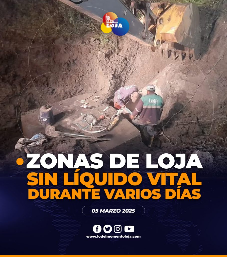 🚨🚫💧¡Loja sin agua! Las fuertes lluvias registradas durante los últimos días, han provocado daños en la conducción de agua del sistema Curitroje-Chontacruz, por lo cual varios barrios de Loja, se han visto afectados sin el líquido vital. Además, el sistema de agua Carigán no es ajeno a las averías, el domingo 2 de marzo se reparó un daño en la transmisión sur, mientras que ayer se registró un desperfecto en el sector Valle Hermoso.
