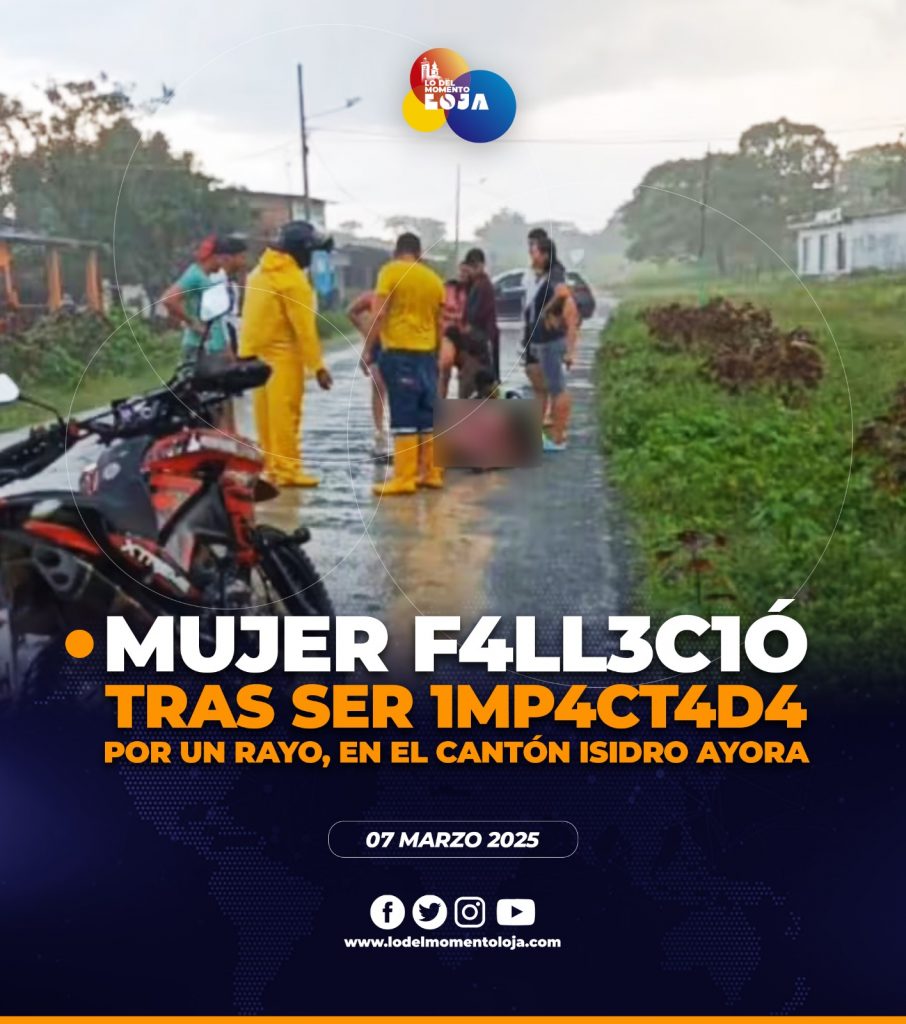 😱⚡✝️¡Es el segundo caso en 2025! Durante las últimas horas de la tarde del 06 de marzo, se confirmó el d3c3s0 de una mujer en el cantón Isidro Ayora, provincia del Guayas, tras ser impactada por un rayo, mientras se encontraba caminando. Testigos mencionaron que la mujer iba por carretera con destino a una cancha de fútbol con otras dos personas cuando se registró el suceso. La víct1m4 fue traslada a un centro de salud donde se confirmó su f4ll3c1m13nt0.