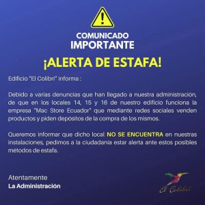 😱🚨📄¡Atentos todos! Tras varias denuncias, de que en los locales 14, 15 y 16, funciona la empresa ‘Mac Store Importaciones’ quienes a través de redes sociales venden productos y piden depósitos de la compra de los mismos, desde la administración del Edificio ‘El Colibrí’ (ubicado en las calles Bernardo Valdivieso, entre 10 de Agosto y José Antonio Eguiguren), se informa a la ciudadanía que dicho local ‘NO SE ENCUENTRA’ en sus instalaciones, por lo cual se solicita a la ciudadanía estar alerta ante estos posibles métodos de estafa.