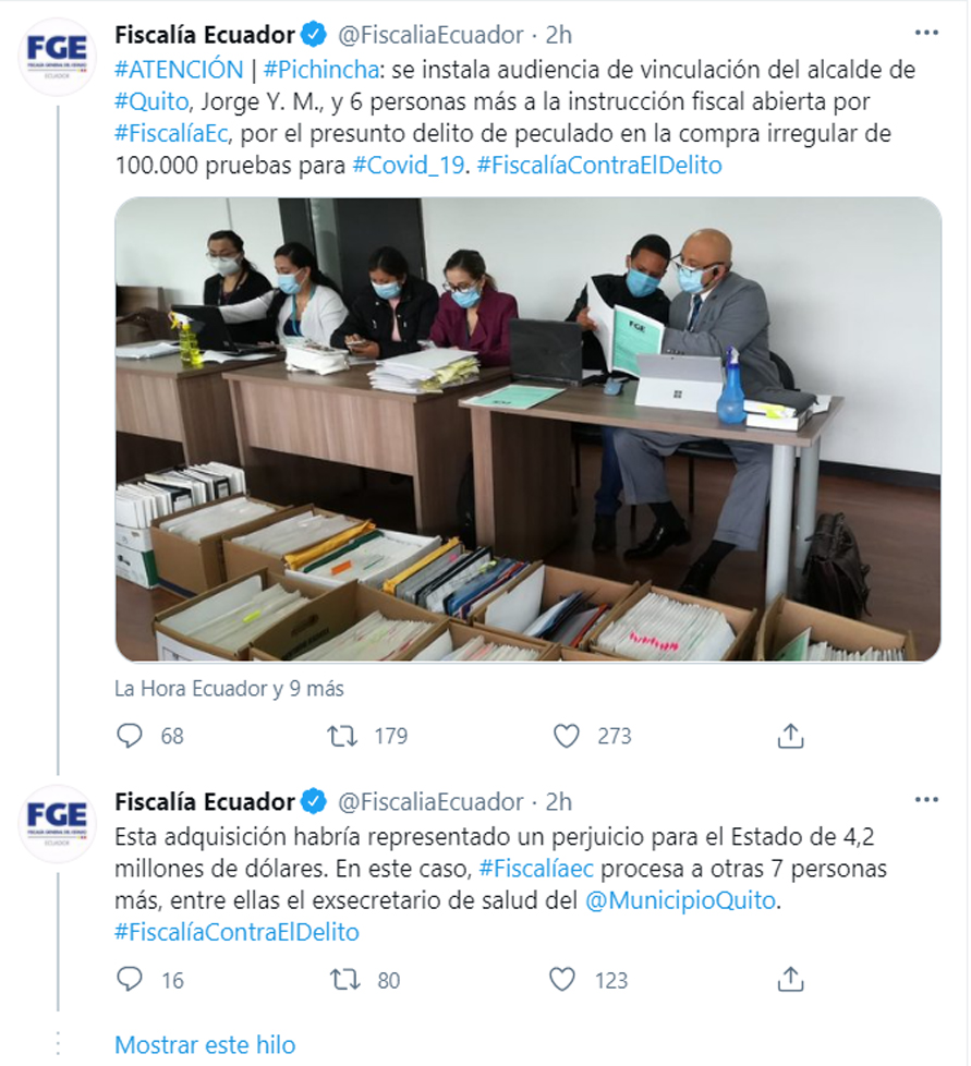 La entidad habla que la adquisición habría representado un perjuicio para el Estado de 4,2 millones de dólares. En este caso, FGE procesa a otras 7 personas más, entre ellas al exsecretario de Salud del Municipio de Quito, quien se encuentra prófugo, así lo mencionaron vía Twitter.
