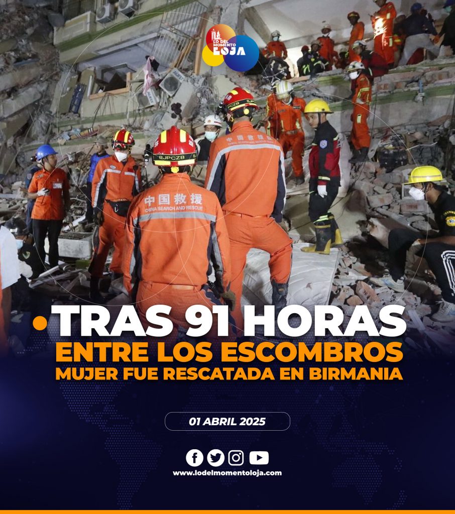 ¡Más de tres días! Una mujer de unos sesenta y tres años fue rescatada durante este martes 01 de abril, en Birmania, después de estar atrapada durante 91 horas entre los escombros tras el terremoto del viernes de magnitud 7,7, posteriormente fue trasladada al hospital, indicó el cuerpo de Bomberos de Myanmar. De acuerdo con las cifras entregadas por la junta militar de Birmania, alrededor de 2.719 personas mvr13r0n y otras 4.521 resultaron heridas tras el fuerte terremoto que también afectó a Tailandia.