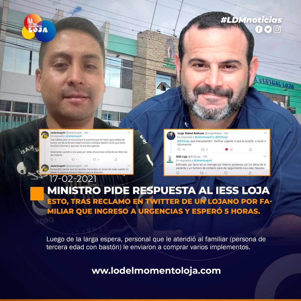 Posterior a ello, Jorge Wated Presidente del Consejo Directivo del IESS, respondió el tuit, manifestando: “IESS Loja, qué está pasando? Verificar urgente lo que le sucedió a Javier e informarme!”