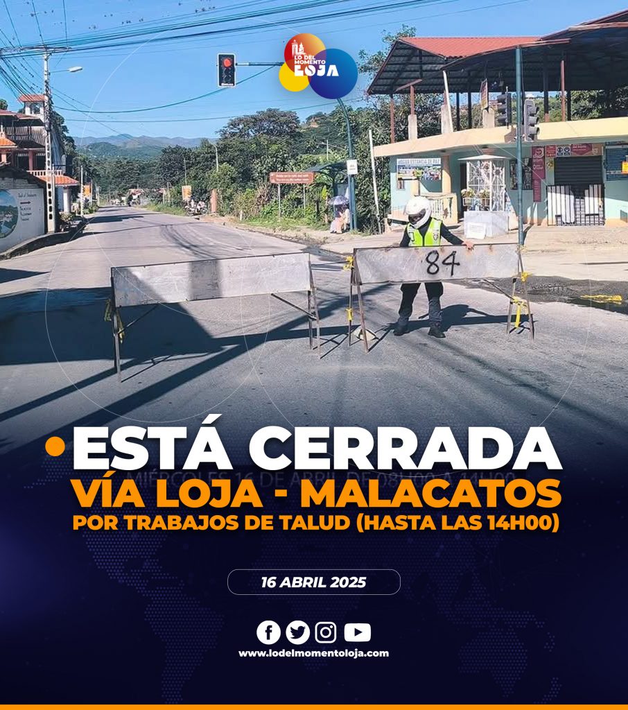 ¡Una vez más! La vía Loja – Malacatos se encuentra cerrada al tránsito vehicular, hasta las 14h00 de este 16 de abril, por trabajos de estabilidad de talud en el sector Nangora, así lo informó la Dirección de Transito, Movilidad y Transporte de Loja. Se solicita a los conductores tomar la ruta alterna, para llegar a su destino.