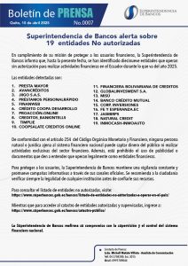 SUPERINTENDENCIA DE BANCOS EXPONEN LISTADO DE ENTIDADES NO AUTORIZADAS PARA REALIZAR ACTIVIDADES FINANCIERAS EN ECUADOR