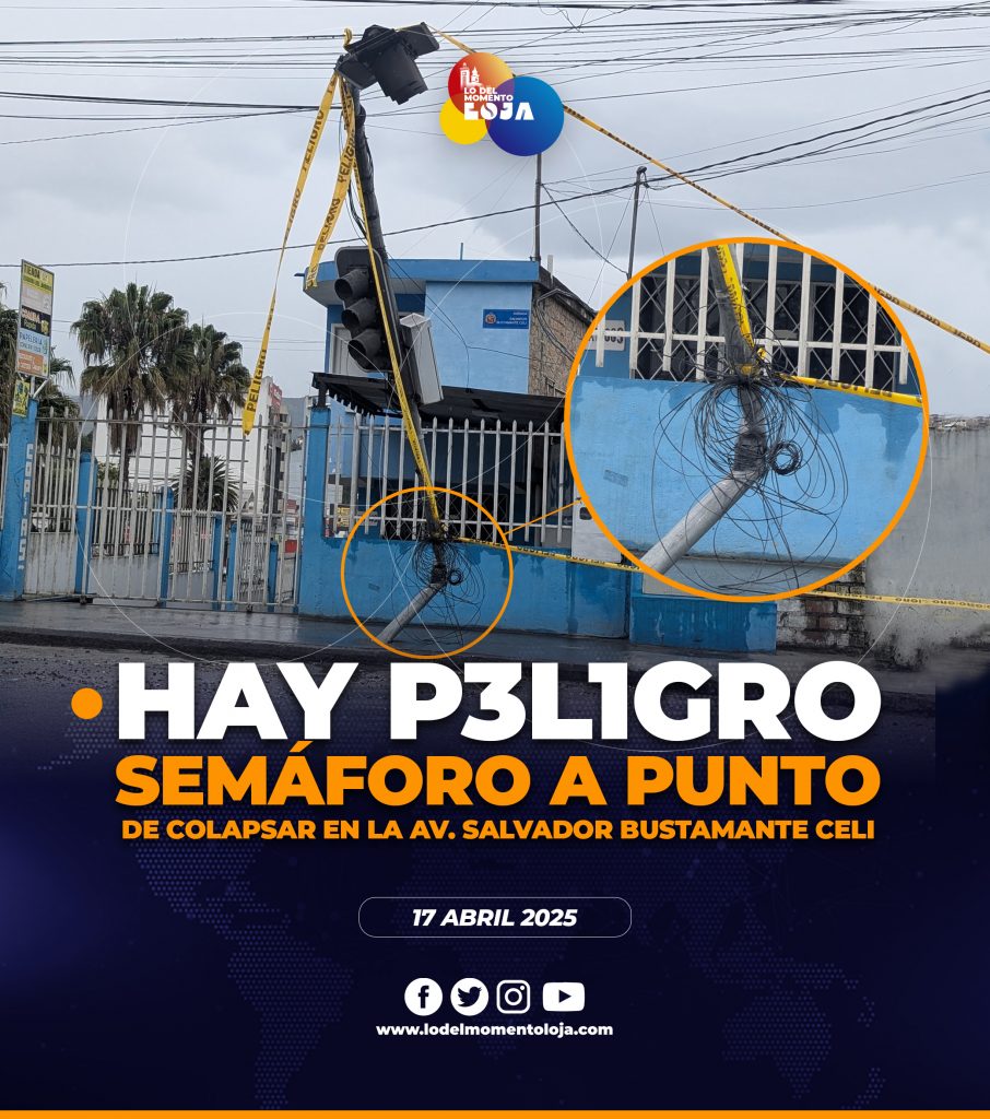 😱🚨🚦¡Tener precaución! En la Av. Salvador Bustamante Celi, a la altura del Conservatorio, se logra presenciar un semáforo que se encuentra en mal estado, debido a que el poste que lo sostiene está partido en dos, exponiendo al riesgo a moradores del sector, como a vehículos que transiten por el lugar. Además el aparato está siendo sostenido por cables del alumbrado público.