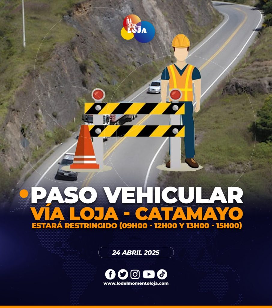 🛣️🚧🕜¡Cerrada por horarios! | El paso vehicular en la vía Loja – Catamayo, estará restringido por trabajos de nivelación de calzada, en los siguientes horarios: De 09h00 a 12h00 y de 13h00 a 15h00. La circulación vehicular será coordinada por la Unidad Operativa de Control de Tránsito. Se recomienda usar la ruta alterna, Vía antigua Loja – Catamayo.
