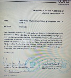Con fecha 26 de septiembre del 2024, el actual prefecto pone a conocimiento de todo el equipo de la Prefectura de Loja, como pone a conocimiento como le otorga los poderes al Coordinador General de la Prefectura en procesos de contratación de bienes, servicio, personal, autorizaciones y salidas, entre otros, documento al que se accedió, sin embargo, un día antes, el mismo funcionario fue captado saliendo de un restaurante reconocido de Loja un 25 de septiembre con algunos contratistas, es decir, un día antes de que se le asignen estas responsabilidades, este quedo registrado y expuesto en el caso investigado por LO DEL MOMENTO LOJA.