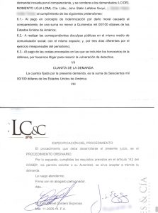 - Indemnización por daño moral causado al compareciente, de una suma no menor a Quinientos mil 00/100 dólares de los Estados Unidos de América. (medio millón)