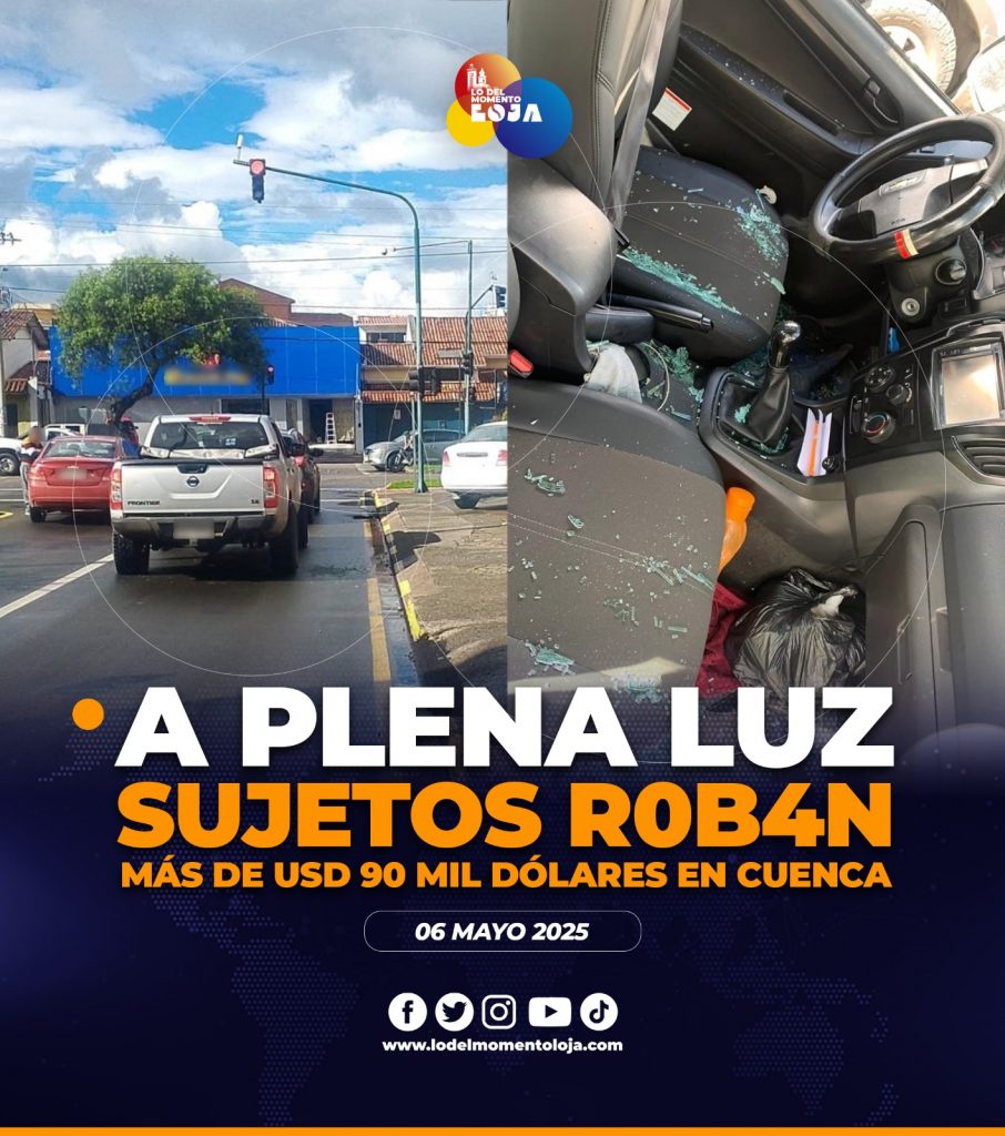 🤯💸🧐 ¡Tierra de nadie! En horas de la mañana de este martes 06 de mayo de 2025, en la ciudad de Cuenca, cuatro presuntos antisociales que se movilizaban en motocicletas habrían interceptado a una pareja en una camioneta en la Av. Ricardo Muñoz Dávila y se llevaron cerca de USD 91.000,00. Según los reportes de la Policía Nacional, la pareja habría retirando USD 30.000,00 en una agencia bancaria del centro de la ciudad, mientras que los USD 61.000,00 en otra entidad cercana. Las autoridades presumen que los presuntos 4s4lt4nt3s hicieron un seguimiento a la pareja antes del 4tr4c0; por su parte, el Gobernador del Azuay, Santiago Malo hizo un llamado a la ciudadanía para que utilicen los servicios prestados por la policía cuyo propósito es evitar ser víctimas de los dueños de lo ajeno.