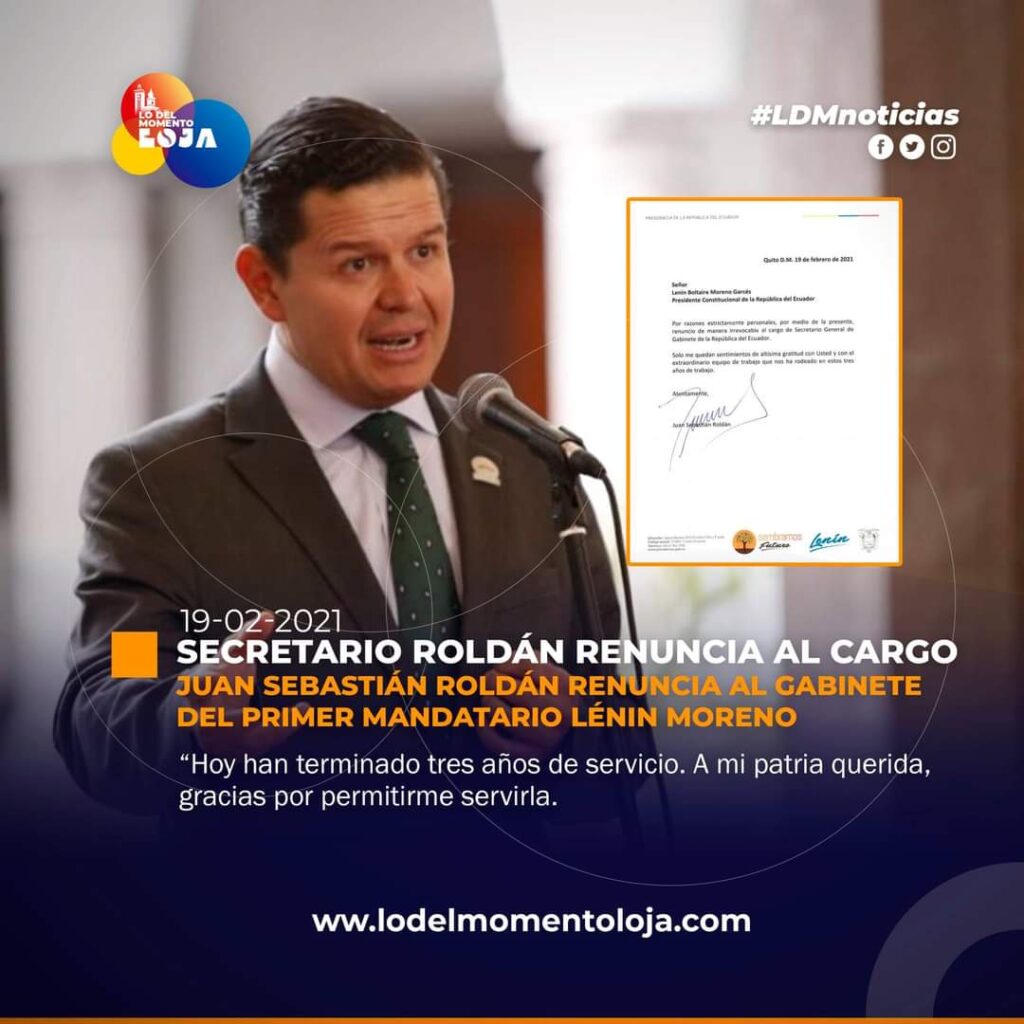 “Por razones estrictamente personales, por medio de la presente, renuncio de manera irrevocable al cargo de Secretario General de Gabinete de la República del Ecuador. Solo me quedan sentimientos de altísima gratitud con Usted y con el extraordinario equipo de trabajo que nos ha rodeado en estos tres años de trabajo.”