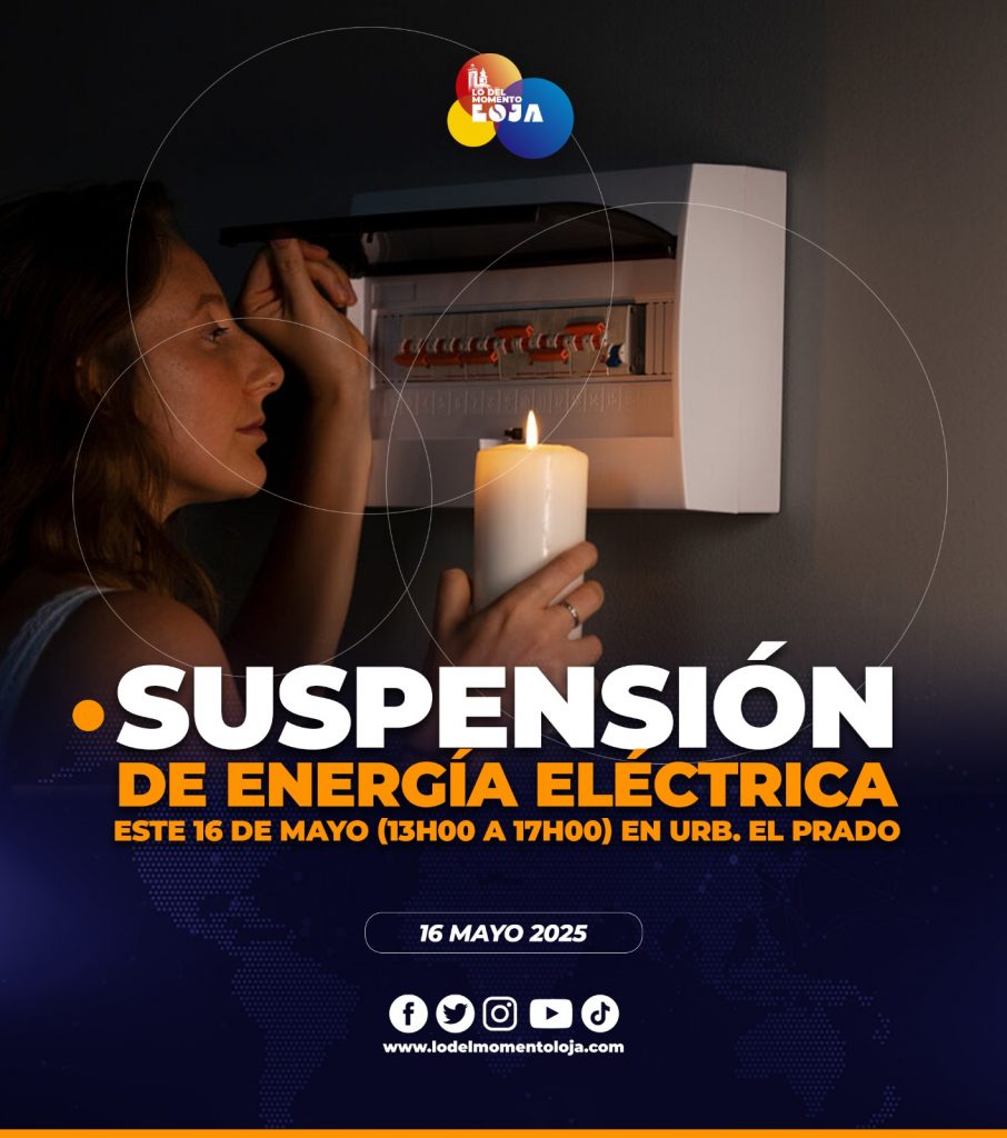 😱🚨💡¡Pilas con el corte de luz! En Loja, este viernes 16 de mayo, se realizarán trabajos de iluminación de la vía de acceso al barrio Tierras Coloradas, que podrían causar la suspensión temporal del servicio de energía eléctrica desde las 13:00 hasta las 17:00, en la Urbanización El Prado.