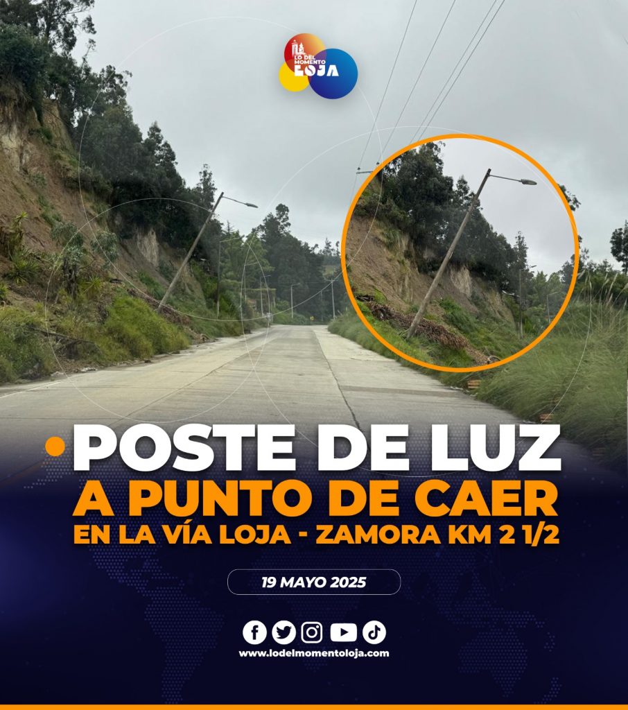 😱⚡💡¡Cuidado al conducir! En el kilómetro 2 1/2 vía Loja – Zamora, se registró un deslizamiento de tierra que ha provocado que un poste de alumbrado público esté a punto de caer, causando daños en la energía eléctrica del sector, a su vez puede ser p3l1gr0 para los conductores que transitan por el sector. Ciudadanía solicita intervención inmediata de las autoridades competentes.