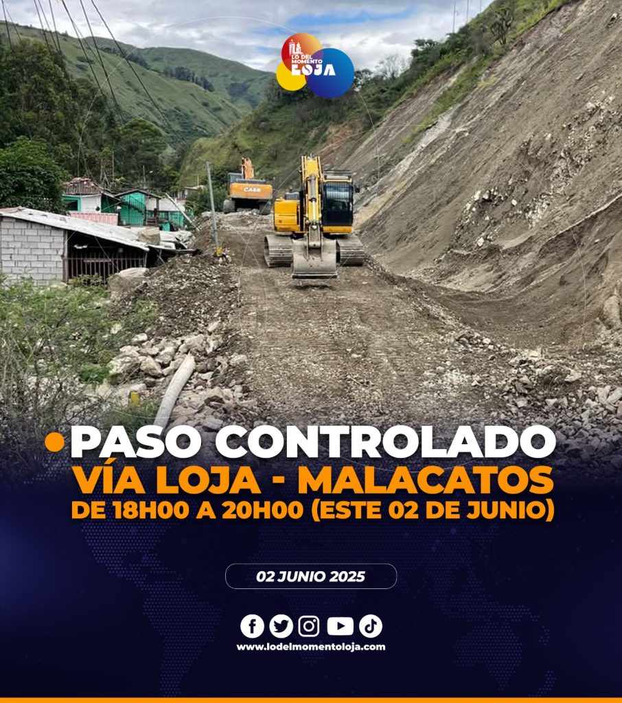 😱🛣️☑️¡Pilas con el horario! Desde el Ministerio de Transporte y Obras Públicas, se pone a conocimiento que este 02 de junio, la vía Loja – Malacatos se habilitará con paso controlado, por trabajos de estabilización de talud en el sector Nangora, en el horario de 18h00 pm a 20h00 pm.