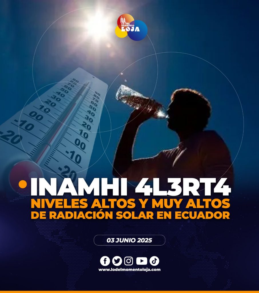 🌄🥵🌡️¡Pilas con el sol! El Instituto Nacional de Meteorología e Hidrología (INAMHI) emitió un pronóstico de radiación ultravioleta (UV) para el martes 3 de junio de 2025 en Ecuador, alertando sobre niveles altos en varias provincias. Según el mapa publicado por la entidad, Cotopaxi, Bolívar, Chimborazo, Cañar, Azuay, Los Ríos y Guayas tendrán un nivel de 6-7, “alto” en la escala de índice de radiación UV. Por su parte, el resto de las provincias del Ecuador tendrán un nivel 8-10 catalogado como “muy alto”, incluyendo Loja. Ante este pronóstico el Inamhi recomienda a la ciudadanía evitar la exposición prolongada al sol entre las 10:00 y 15:00.