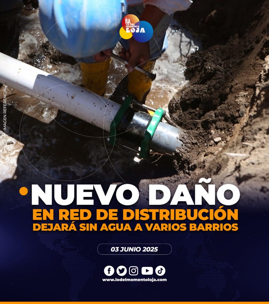 🧐🚫💧¡No habrá agua! Desde la Unidad Municipal de Agua Potable y Alcantarillado de Loja (Umapal), se informa que este martes 3 de junio, se registró un nuevo daño en la red de distribución de agua potable, por lo cual los barrios: Jipiro Alto, Jipiro Paraíso, Amable María Alto, Parkenor, Altos del Valle, colegio militar Lauro Guerrero y sectores aledaños, no contarán con el servicio del líquido vital. Una vez finalizadas las labores de reparación se restablecerá el mismo.