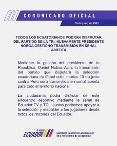 🤩⚽🇪🇨 ¡Una vez más! Desde el Gobierno del Presidente Daniel Noboa se ha gestionado que la transmisión del partido entre la selección ecuatoriana este martes (10 junio) contra Perú, sea emitida en señal abierta para todo el territorio ecuatoriano, mediante TC televisión y Ecuador TV.