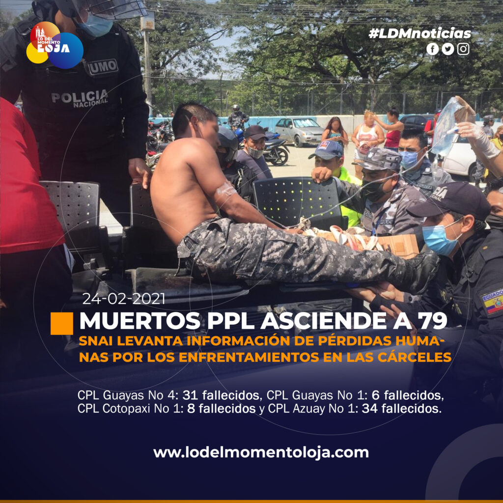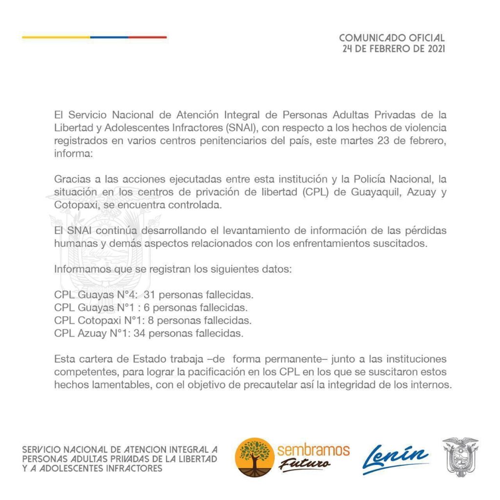 Mediante comunicado 24 de febrero del 2021, el Servicio Nacional de Atención Integral de Personas Adultas Privadas de la Libertad y Adolescentes Infractores (SNAI), con respecto a los hechos de violencia registrados en varios centros penitenciarios del país, este martes 23 de febrero, informó: