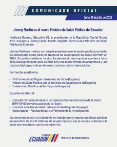 🏥🥼🩺¡Nuevo al cargo! A través de decreto emitido la tarde de este 15 de julio de 2025, el presidente Daniel Noboa designó a Jimmy Martin como nuevo ministro de Salud Pública del Ecuador. Martin reemplazará a Juan Bernardo Sánchez Jara, quien asumió esa cartera de Estado el pasado 27 de mayo de 2025.
