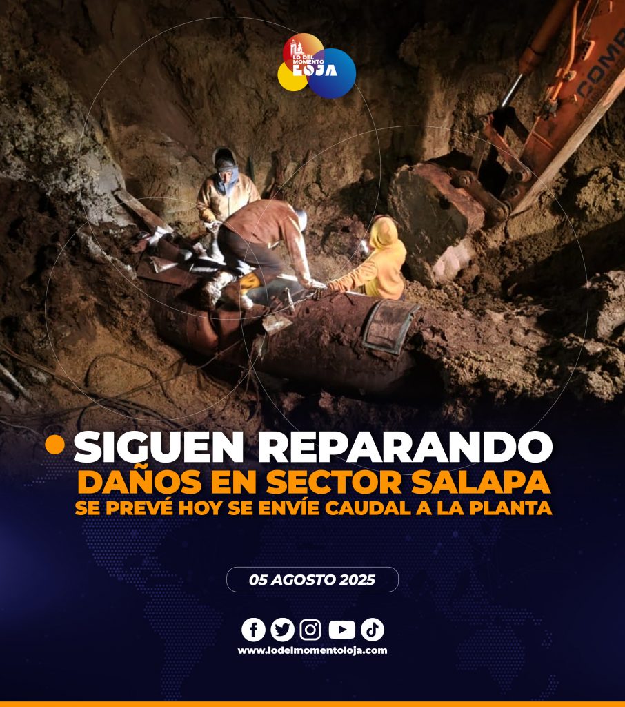 🚨🚱🏘️¡Sigue el daño! Desde el Municipio de Loja, se informa que las labores de reparación de los daños en el sector Salapa se extendieron hasta el día de hoy, el personal de la Umapal, se encuentra en el lugar terminando de reparar el problema. Además se prevé que en horas de la mañana de este 05 de agosto, se envíe caudal a la planta de tratamiento Carigán y en el transcurso del día, procurar normalizar el servicio a los hogares lojanos.