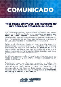 ‘Los GADs cantonales y parroquiales enfrentan una grave situación: El gobierno Nacional los mantiene sin pagos por más de tres meses, afectando directamente la planificación ejecución de obras que impulsan el desarrollo local y prestación de servicios esenciales para la provincia de Loja, esta realidad es insostenible e inaceptable.