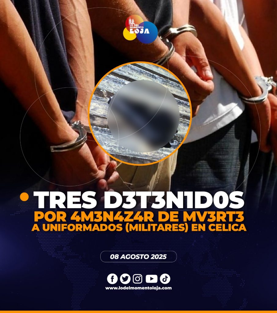 😱🚨🪖¡Rápida acción! La oportuna coordinación entre la Policía Nacional del Ecuador y miembros de las Fuerzas Armadas, con sede en el circuito Celica, provincia de Loja, logró la aprehensión de tres ciudadanos, quienes habrían emitido 4m3n4z4s en contra de varios militares que se encontraban cumpliendo su labor en la prevención del reducto militar. Durante la aprehensión, se pudo constatar que uno de los sujetos portaba un objeto con características similares a un 4rm4 de fv3go, el cual habría sido utilizado para intimidar a los uniformados. Todos los implicados, fueron puestos a órdenes de las autoridades competentes.