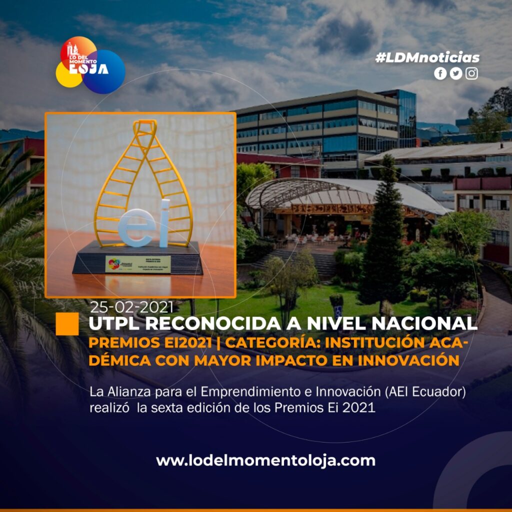 La Universidad Técnica Particular de Loja fue reconocida al ganar en la categoría: «Institución académica con mayor impacto en #innovación» en la VI Edición de los #PremiosEi2021. Esto al competir contra la Universidad Católica de Cuenca.