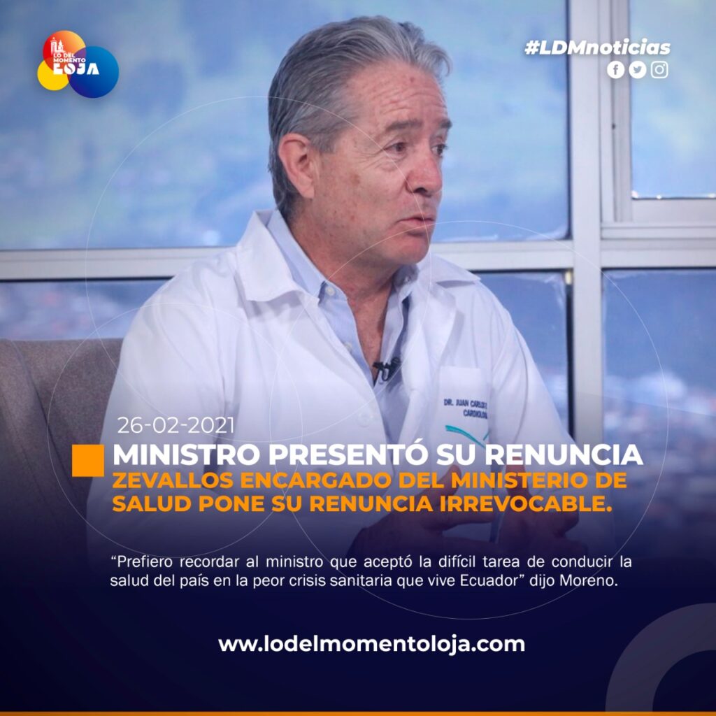 Luego de casi un año en el cargo, Juan Carlos Zevallos mediante un escrito dirigido al presidente de la república Lenin Moreno, anuncia su renuncia irrevocable al cargo como Ministro de Salud.