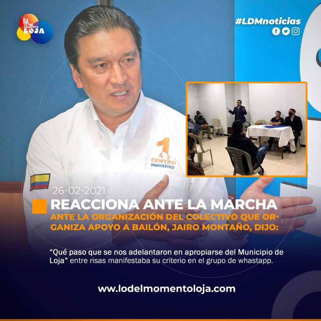 Jairo Montaño exdirector Provincial de Centro Democrático en Loja, se pronunció sobre la organización del colectivo “Loja para todos” que realiza la marcha a favor del Alcalde Jorge Bailón, esto mediante un grupo de whastapp donde compartían fotos de la reunión de ayer y mencionaba de forma textual lo siguiente: “Qué paso que se nos adelantaron en apropiarse del Municipio de Loja. jijiji….”