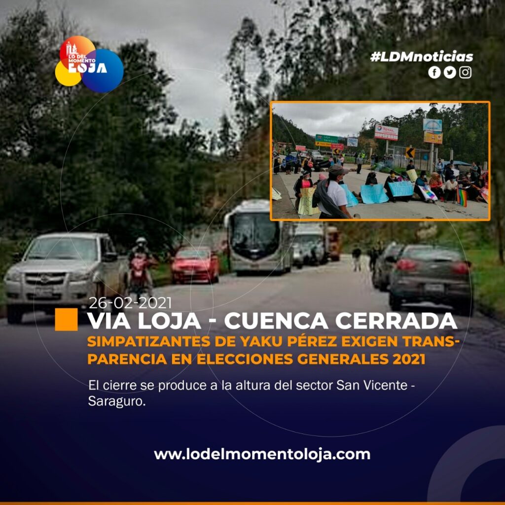 El cierre se registra a la altura del sector San Vicente de Saraguro, exigen transparencia en la elecciones generales del 2021 y en apoyo al candidato presidencial Yaku Pérez.
