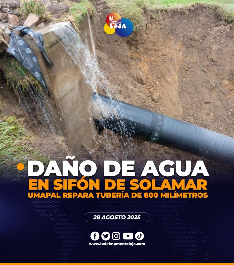 😱🚨💧¡Nuevo daño! Desde el Municipio de Loja se informó que desde la tarde del miércoles 27 de agosto, se produjo una fuga de agua en el sifón de Solamar, personal de mantenimiento de la Umapal realiza la reparación de la tubería de acero de 800 milímetros, para posteriormente enviar caudal a la planta de tratamiento Carigán.