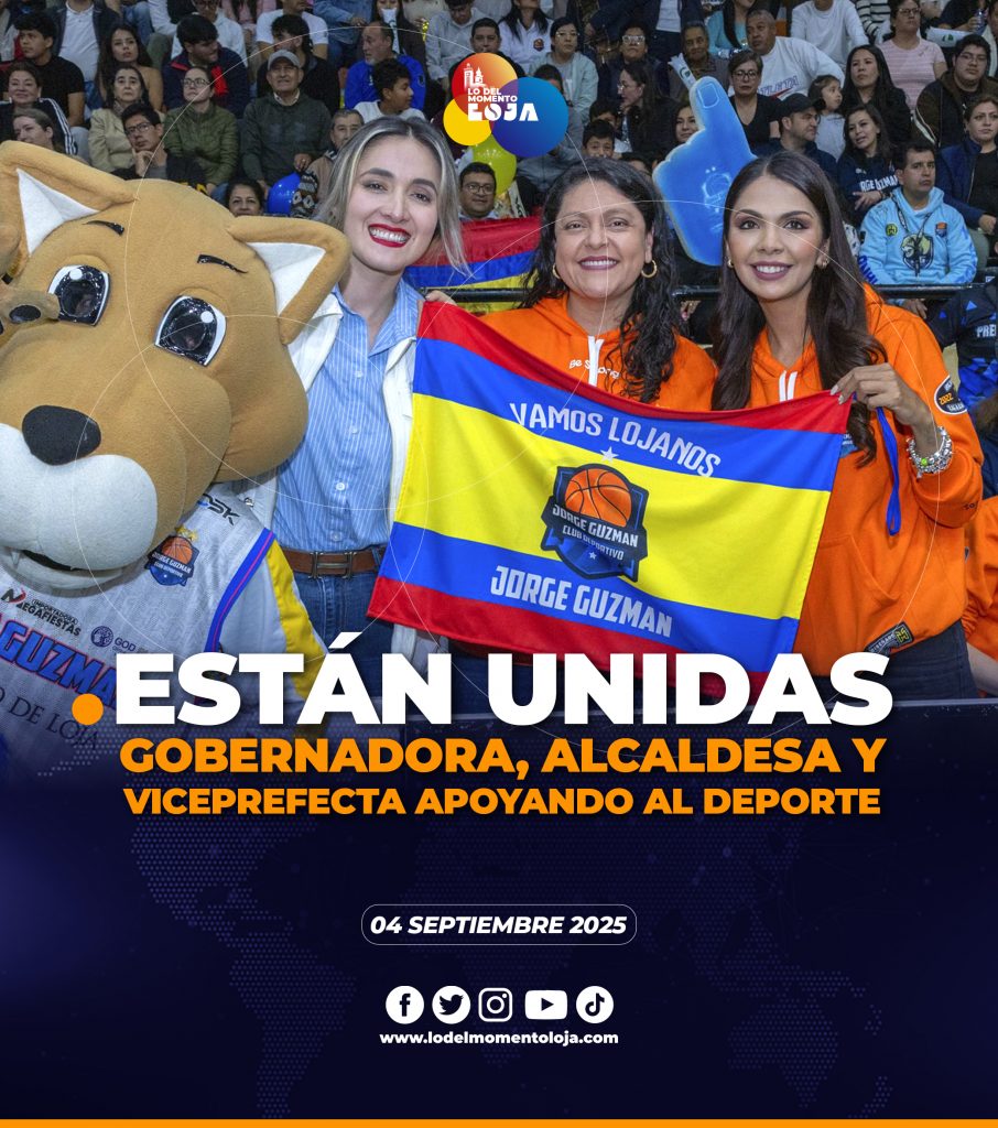🤝🏻🏀💜 ¡Dando el ejemplo! En el último encuentro del club Deportivo Jorge Guzmán mientras disputaba su pase a la final contra Barcelona SC, mismo que terminó con resultado favorable, no pasó por desapercibida la fotografía donde las principales autoridades de Loja estuvieron alentando al equipo, tal es el caso como: Alexandra Jara como Gobernadora de Loja, Diana Guayanay como Alcaldesa de Loja y, María José Sotomayor como Viceprefecta de Loja, todas juntas apoyando al deporte, como autoridades y como hinchas, demostrando que la unidad entre autoridades no debe quebrajarse por las líneas o diferencias políticas por la que forman parte cada una.
