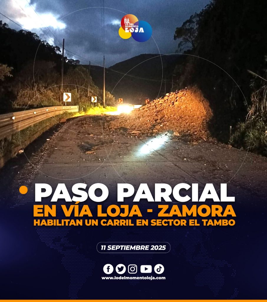 ⚠️👷♂️🚜¡Atentos con la vía! Desde el Ministerio de Transporte y Obras Públicas, se informa que se habilita el paso de manera parcial en la vía Loja – Zamora (E50), sector El Tambo. Personal y maquinaria continúan trabajando para restablecer completamente la circulación. Se pide a la ciudadanía que transita por el sector, conducir con precaución.