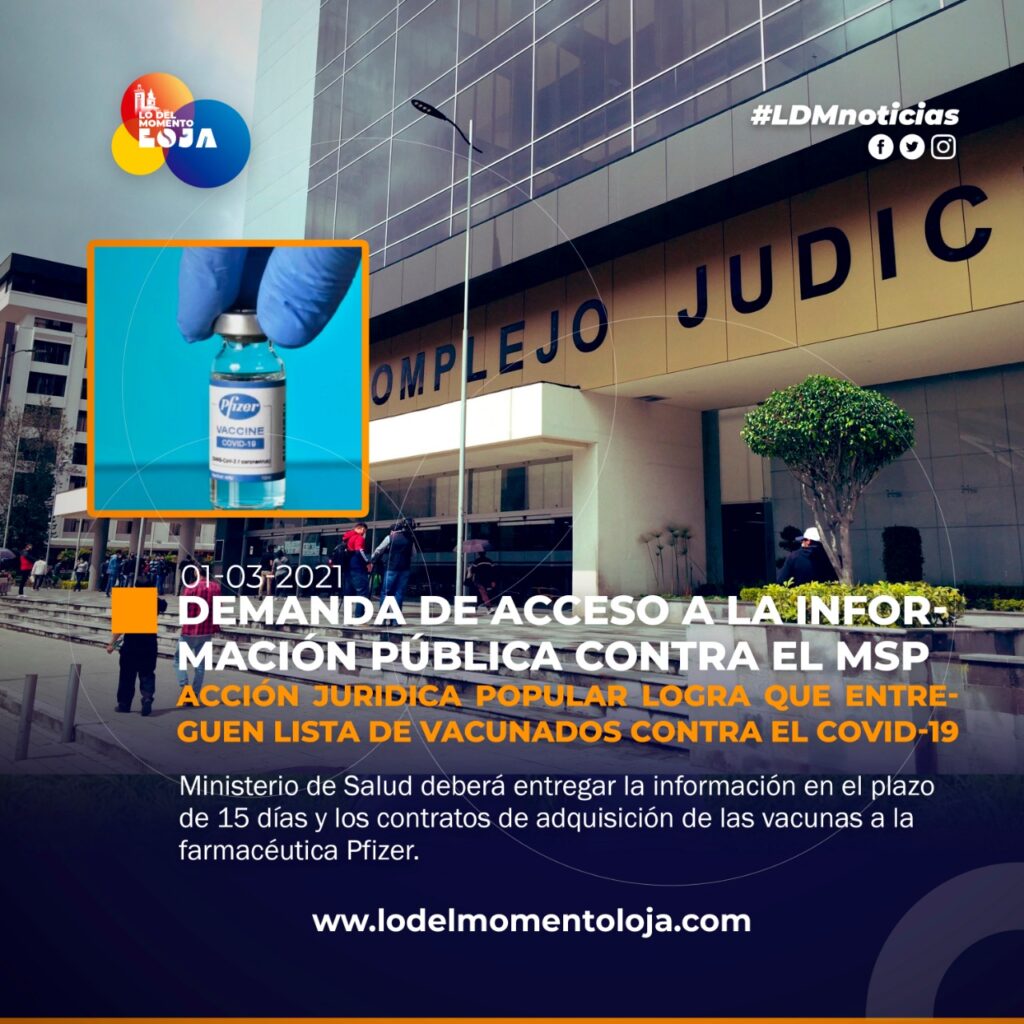 Hoy, la Jueza Celma Espinosa, concedió la acción constitucional de acceso a la información pública presentada por Acción Jurídica Popular por lo que ordena al Ministerio de Salud, en el plazo de 15 días se entregue el listado de vacunados hasta el momento y los contratos de adquisición de las vacunas a la farmacéutica Pfizer.
