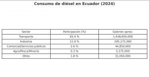 Según los datos oficiales, el combustible diésel es utilizado en un 83,4% en transporte, de este porcentaje, el 67% es carga pesada; el 11,9% en el sector industrial; el 2,6% en lo comercial y servicios públicos; el 0,3% en el Agro, pesca y Minería; mientras que otros sectores, representan el 1,8%.