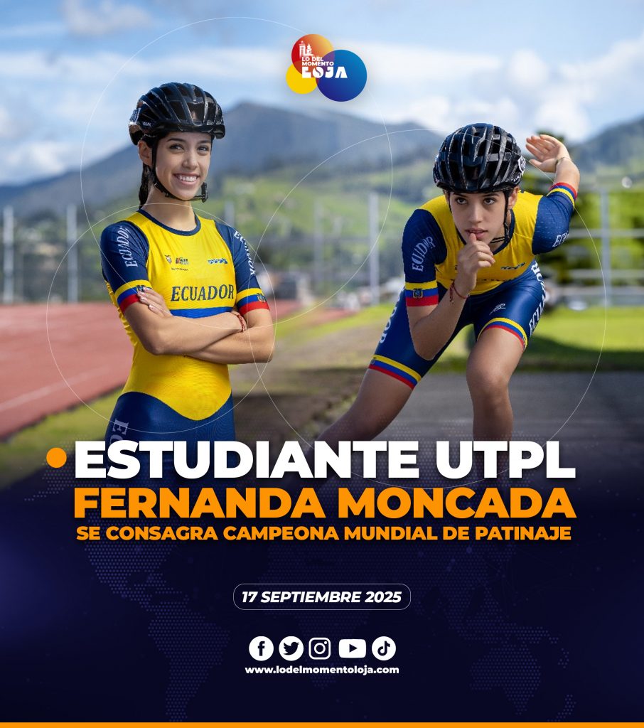 🇪🇨🏆🛼¡Orgullo UTPL! La Universidad Técnica Particular de Loja (UTPL) celebra con orgullo el triunfo internacional de Fernanda Moncada Guarnizo, estudiante de la carrera de Administración de Empresas en modalidad a distancia y en línea, quien se consagró como Campeona Mundial de Patinaje de Velocidad en Ruedas en el Speed World Championship 2025, realizado en Beidaihe, China. El pasado 13 de septiembre, Moncada obtuvo el primer lugar en la categoría damas, nivel senior, en la exigente prueba de 5000 metros puntos, consolidando así su nombre entre las mejores patinadoras del mundo.