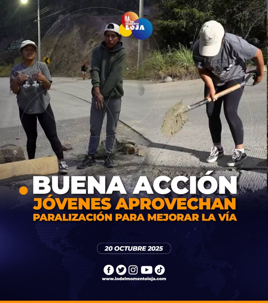 🛣️🚧👏🏻¡Digno de aplaudir! Durante la jornada de paralización en el cantón Saraguro, un grupo de jóvenes decidió aprovechar la ausencia de tránsito vehicular, para realizar labores de bacheo en la vía Panamericana. La iniciativa fue liderada por la creadora de contenido Lady Priscila, quien junto a otros jóvenes se organizó para reparar los tramos más deteriorados de la carretera. Su trabajo voluntario ha sido ampliamente reconocido por los habitantes del sector, quienes destacan su ejemplo de civismo, responsabilidad y liderazgo comunitario.