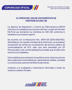 😱📈🚫¡Se mantendrá el precio! Mediante un comunicado oficial realizado por el Ministerio de Ambiente y Energía, el Gobierno Nacional a través de la Agencia de Regulación y Control de Hidrocarburos (ARCH) informó a la ciudadanía, que el precio del Gas Licuado de Petróleo (GLP) de uso doméstico se mantiene en USD 1,65, conforme lo establece la normativa vigente. Esta medida busca mantener el equilibrio entre todos los actores de la cadena de comercialización, garantizando calidad, cantidad y un precio justo para las familias ecuatorianas.